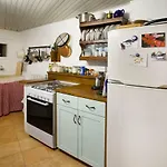 Obsahuje také kuchyňské zařízení včetně rychlovarné konvice, chladničky a skleněného nádobí.